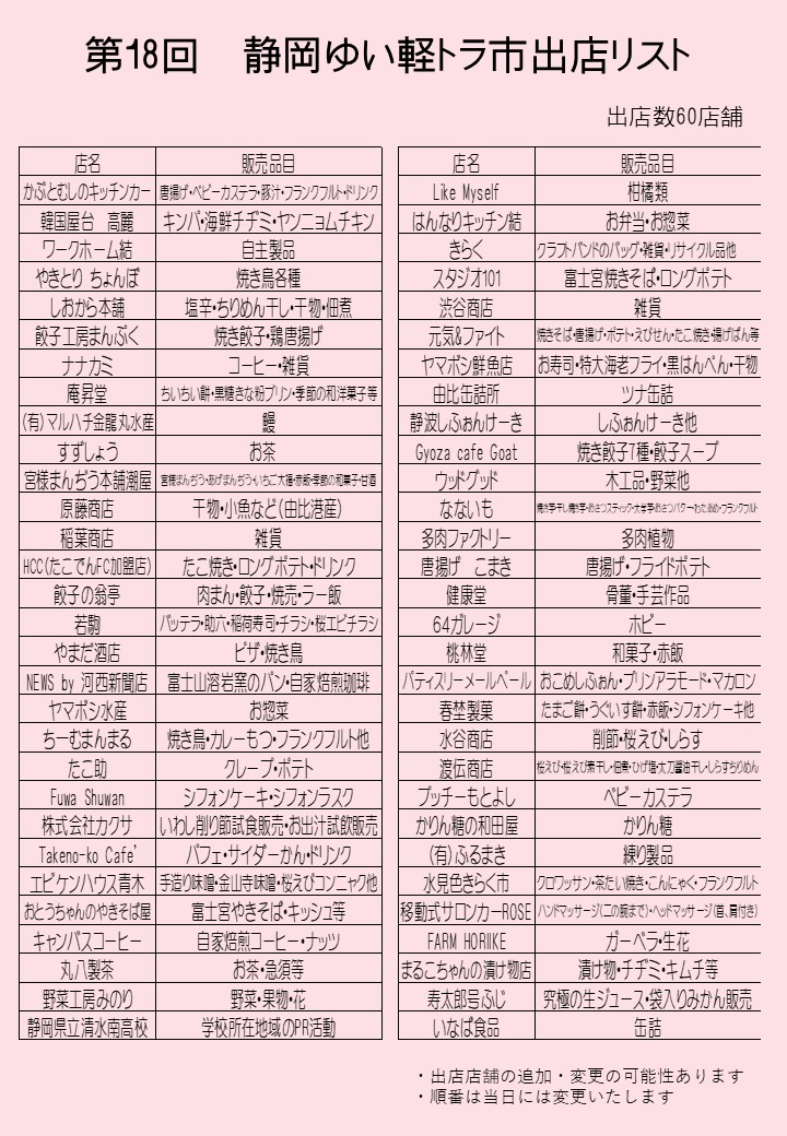 | 18 | tomosu factory Joe | クレープ・綿あめ・ポップコーン |